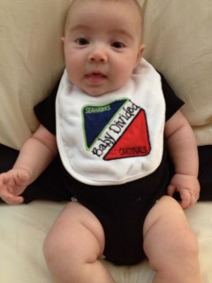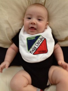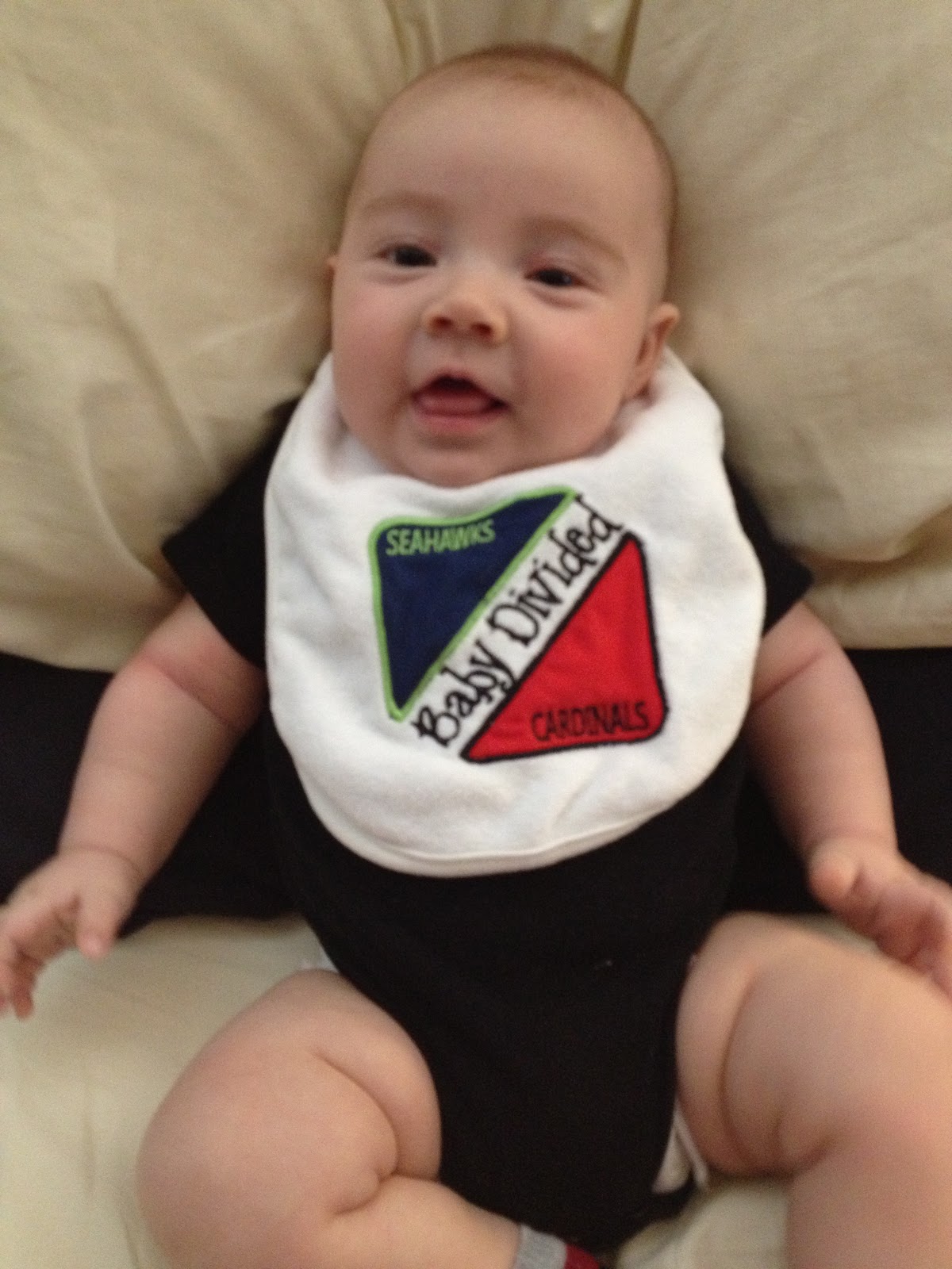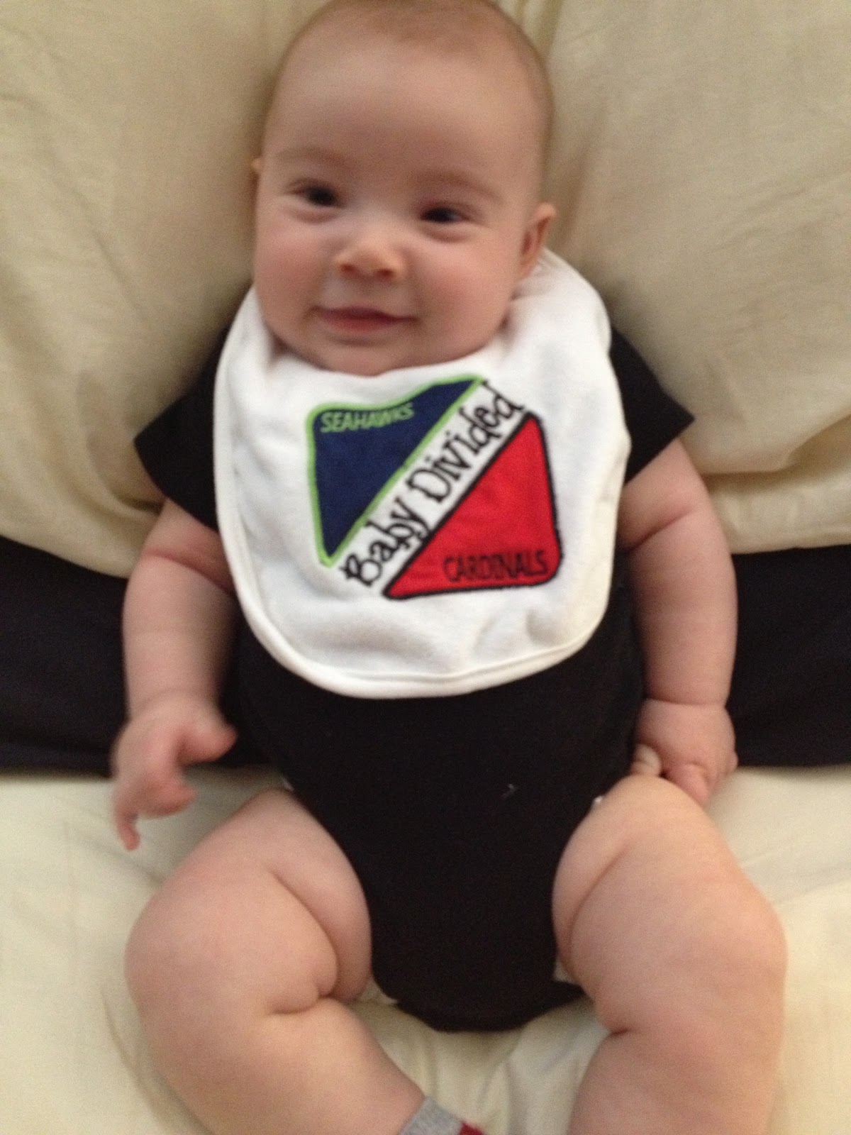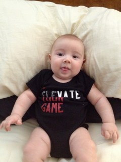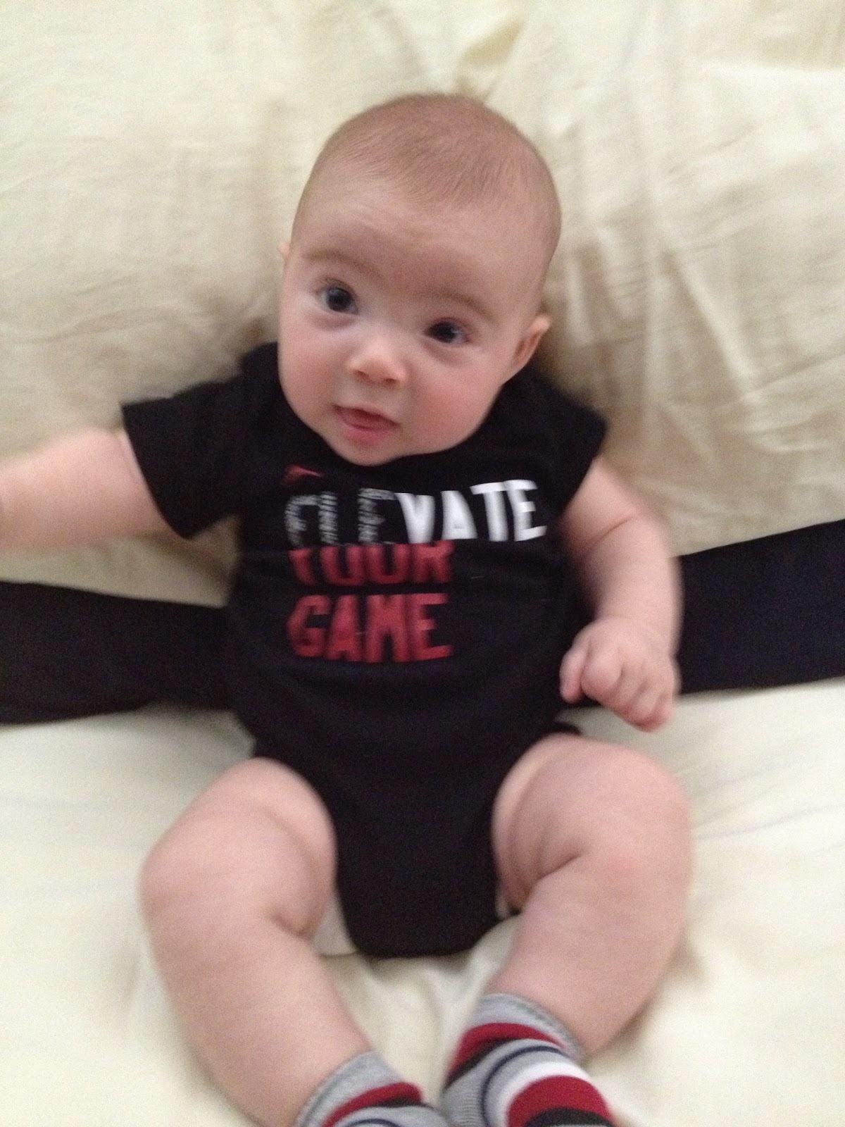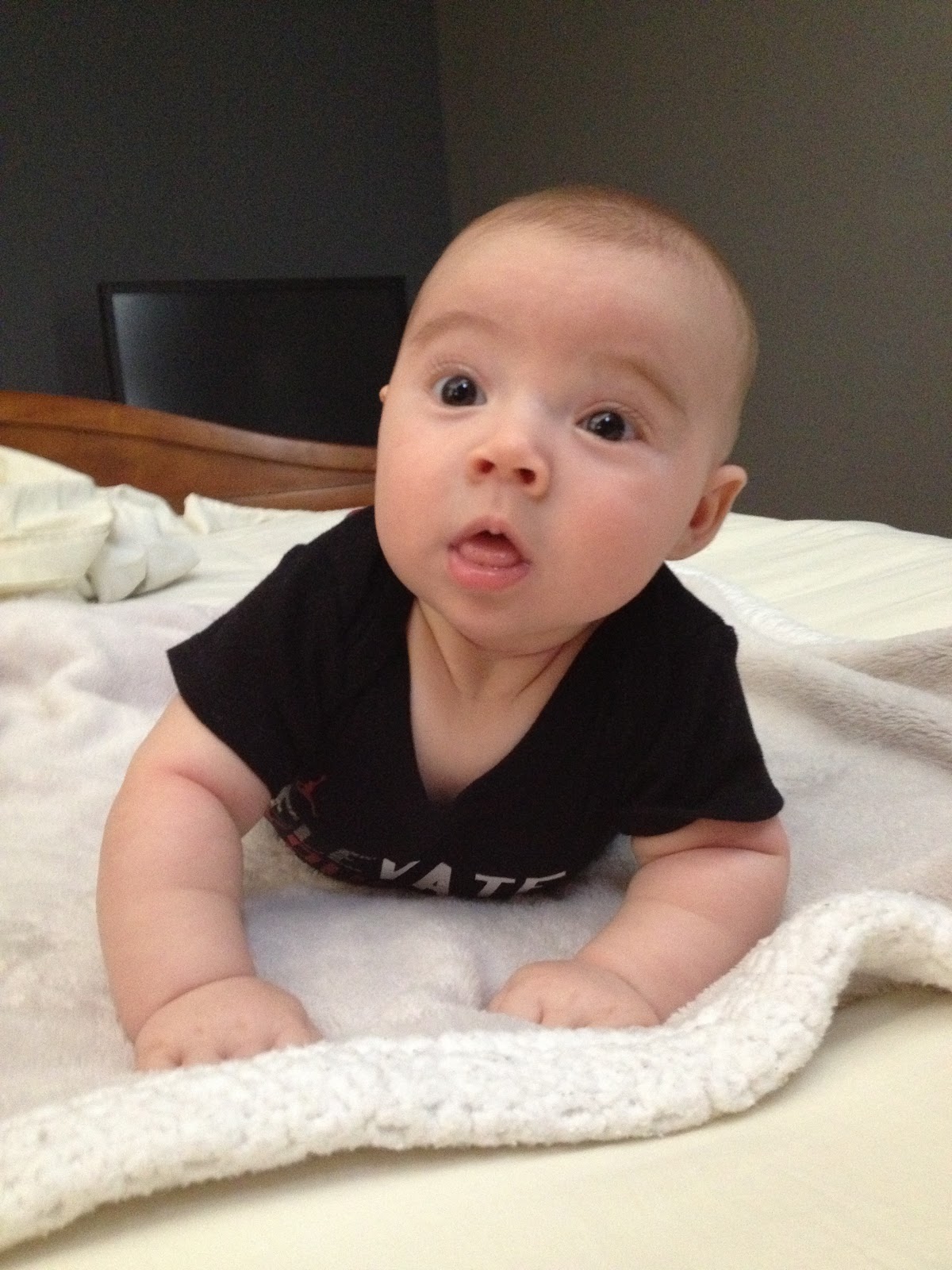 Milestones: We have seen a rollover from his tummy to his back (not regularly but it has happened). Also he can sit up for a minute or so without help, even longer propped up on pillows. It is quite funny to watch him slowly fall mostly because the look on his face is so confused right before one of us catches him. Daddy & him have regular conversation it’s so cute to watch them talk back & forth. His face lights up with recognition & smiles when he sees both mommy & daddy. He also love love loves to play on his activity mat & kick the piano. Little man is developing strength very quickly! Any dangly toys keep him intrigued for small periods of time. He loves to stare at that baby in the mirror, suck on his hand or thumb or blanket, and most things that you give him already go to his mouth. We have a smart lil one.