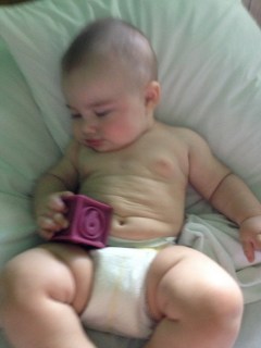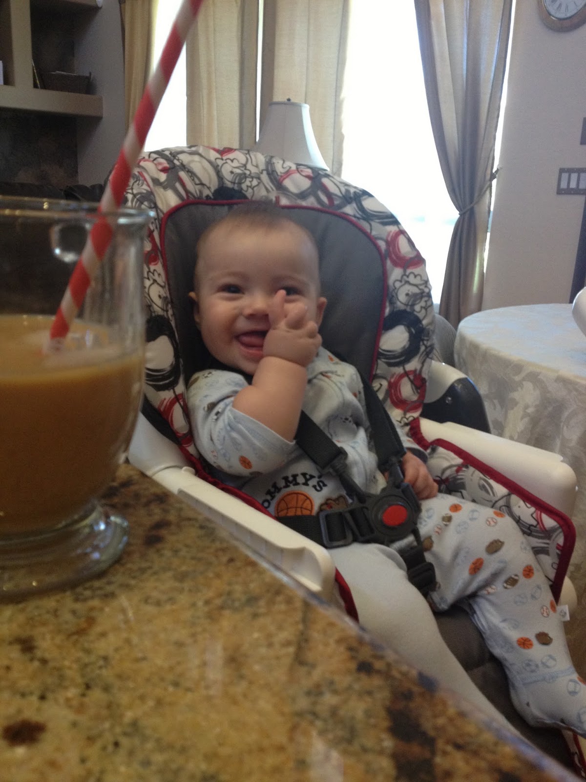Feeding: In the last month we have really upped his real food intake. (see this post for all past the details). After our chat with the pediatrician today I am increasing it even more. Starting today he got 3 square meals. Plus a snack and then nursed a little right before bed.