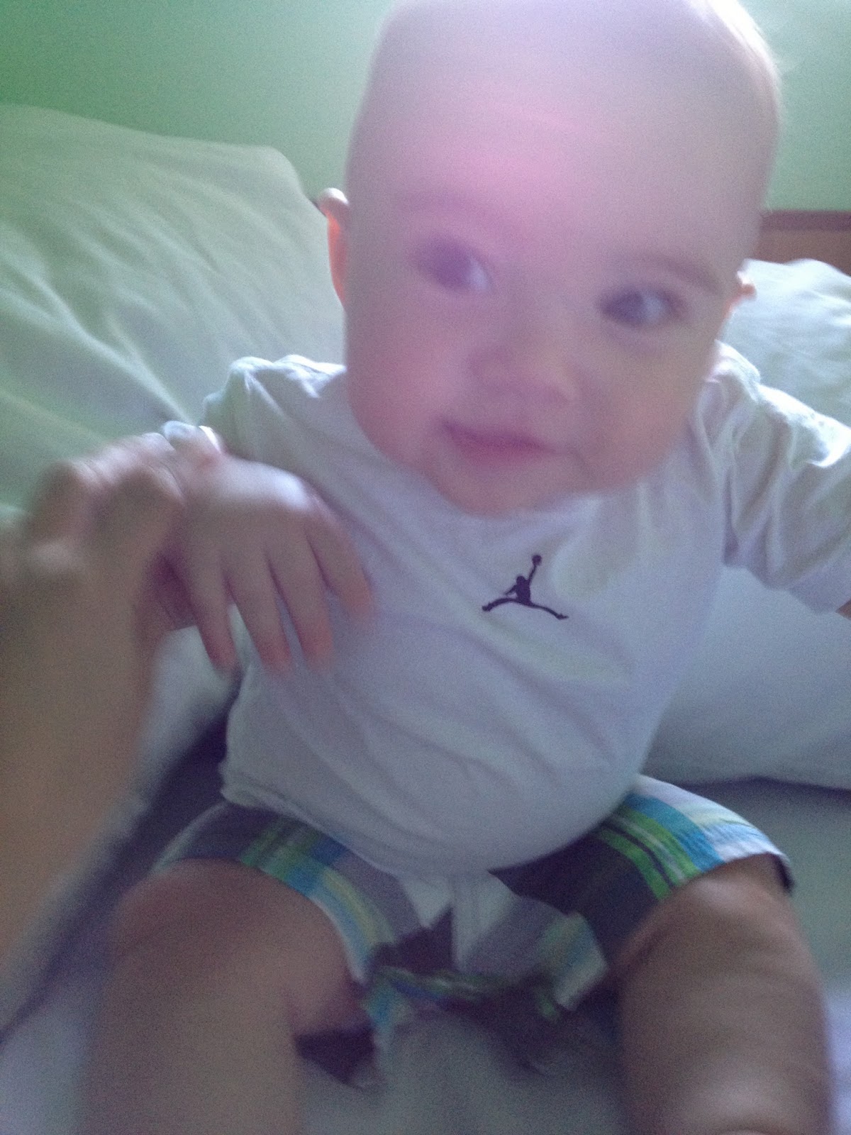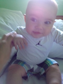 Milestones: Oh gosh he is sooo close to crawling. His rocking is out of control and he’s scooting all over the place. Lately he has really taken to imitating us, it’s really funny to see him blow raspberries, pretend cough, try to sneeze, and it’s the cutest thing when he yawns and makes noise. His facial expressions have gotten so animated. Along with his cries. Boy does this kid have our number when it comes to fussing. He knows he just has to start and we will respond (uh oh, time for mommy & daddy to get tough). He has been getting a lot stronger, sitting on his own for short periods of time and tonight he was sitting up for longer than he ever has. It’s really fun when he tries to crawl and he rolls to one side and poses. (My mom compares it to a Burt Reynolds centerfold & Brad sings Vogue when he does it). He is also grabbing everything and transferring toys (or whatever he’s holding) back and forth between hands.