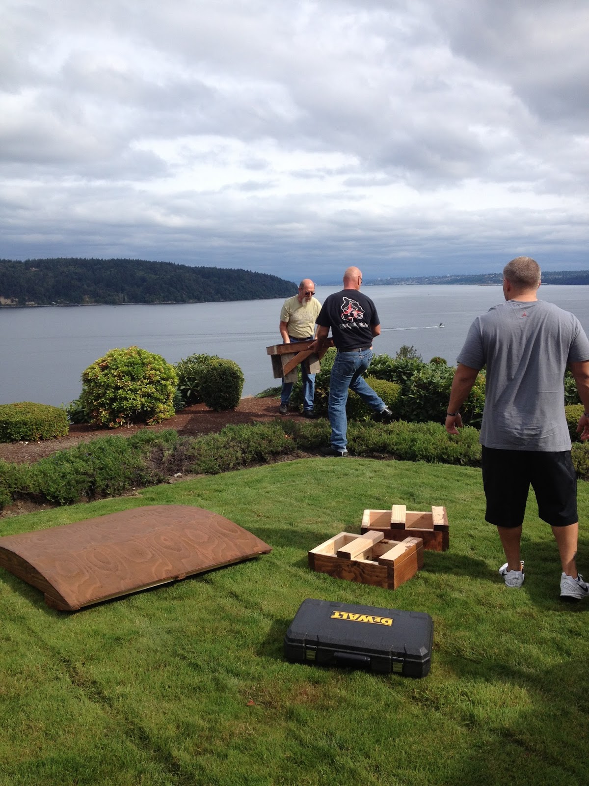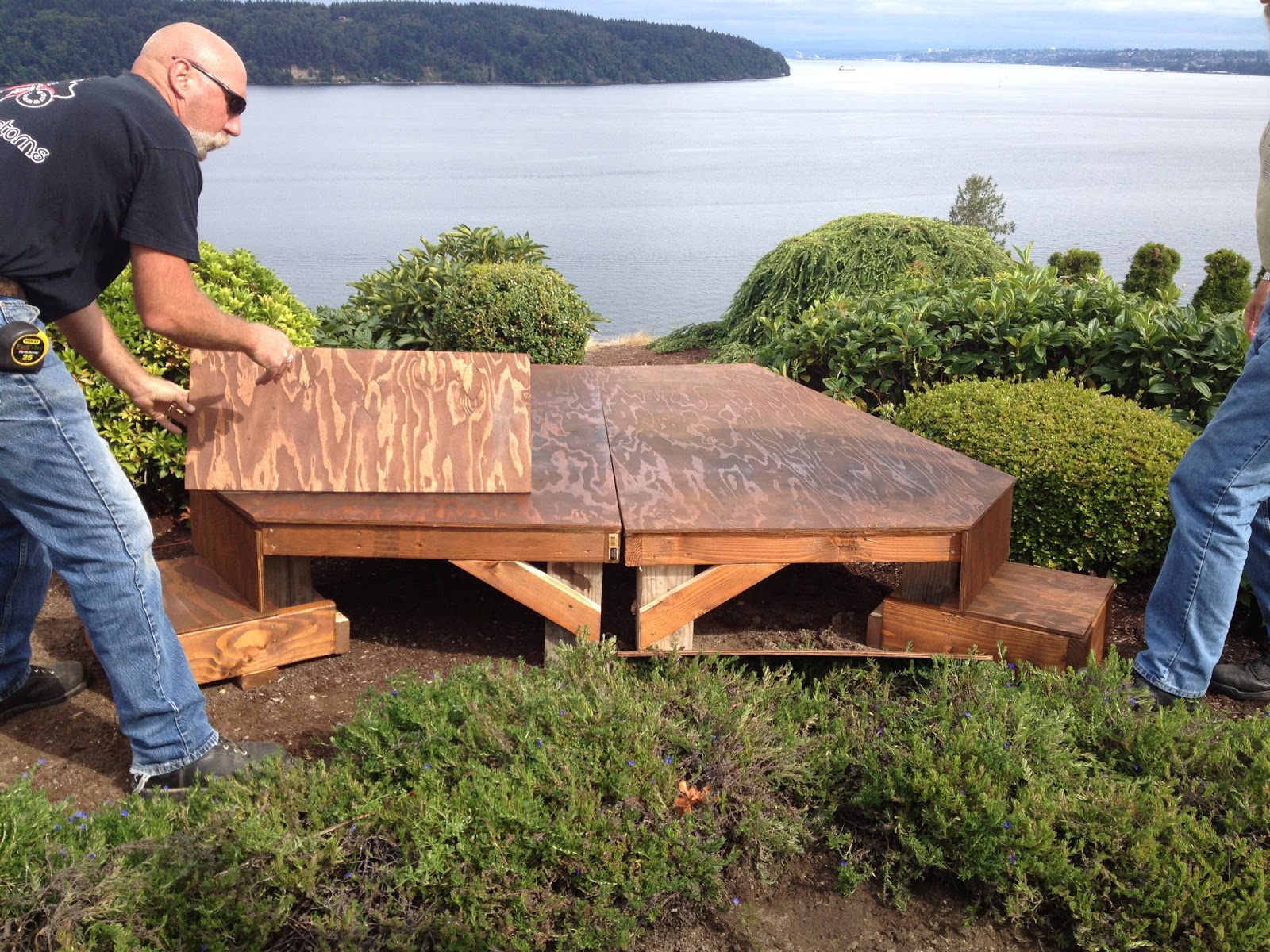 Thursday we spent the day mostly relaxing. Brad’s Mom & I met with a couple caterers for ideas about the small cocktail hour we are having immediately following the ceremony at their house. Only to realize that it seems to be an added expense we don’t necessarily need. Which is nice because we now have some fabulously simple ideas that will be sure to tide people over until they get to the reception! In the early evening my Dad, Uncle & Mom came to the house to bring the stage which they custom built for our wedding. They did a trial set up and it is so freakin’ cool!!