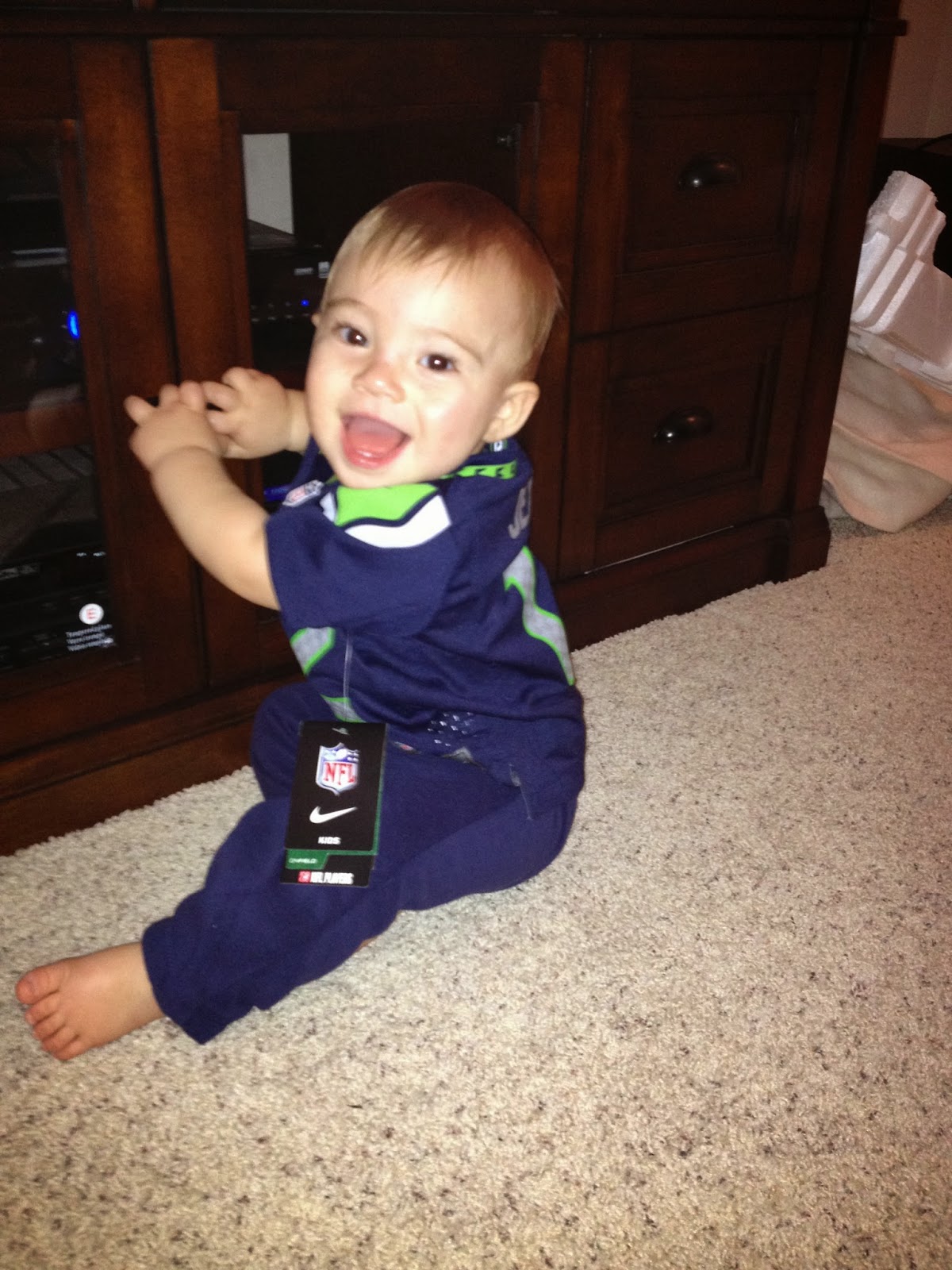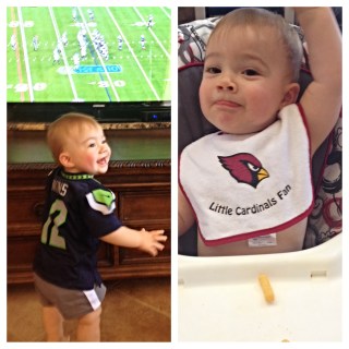 Oh & making sure our kid is appropriately dressed for whichever team is playing. Knowing that he will probably follow his daddy’s lead on this one, I’m more than happy to put him in Seahawks colors during Hawks games and Cardinal red for Cards games. When they played each other I went totally neutral with white only {poor kid has crazy rival team parents lol}. I do know that it’s tons of fun to have a little one to dress up however you want to!!