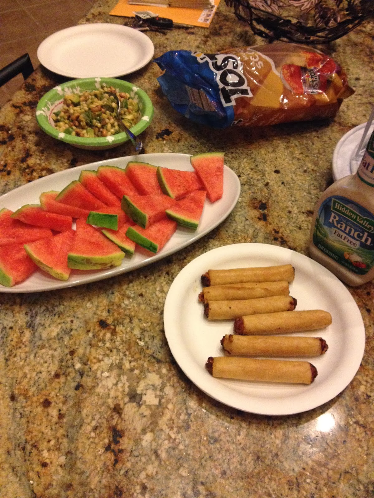 | cowboy caviar, eggrolls & watermelon (see what I mean about random mix) |