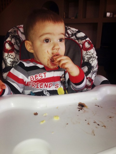 He is growing like a weed and loves food more & more every day. It cracks us up when he is so cranky that nothing seems to make him happy except food. *Best Parent Award* Keep feeding him until he smiles. But seriously, sometimes it’s the only thing that works. This morning was no exception to the, Cash hearts food mantra. We had coconut pancakes for breakfast and mommy threw in a few dark chocolate chips just to spoil him (cause it’s Friday duh). We almost couldn’t believe how fast he emptied his tray. Still pretty cute with a face covered in chocolate though, right.