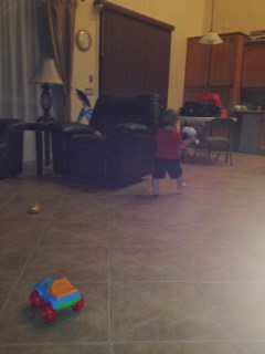 I’m not kidding when I say he wont give it back… here he is shaking his head no at me with a death grip on the dog and then running away from the camera haha. It even made it up to his crib somehow!
