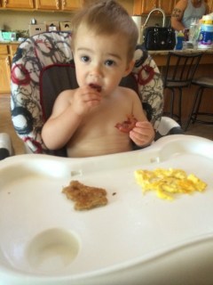 | this morning he tried bacon for the first time. it was a WINNER 🙂 |
