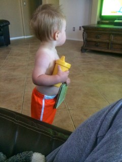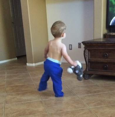 FAVORITE TOYS: Oh man, there is a little stuffed dog that daddy has named Chachi. If you ask him for it he runs right to it (unless he’s in his hand of course). Tonight he had a death grip on the poor thing after he realized I had captured him this afternoon for a wash.