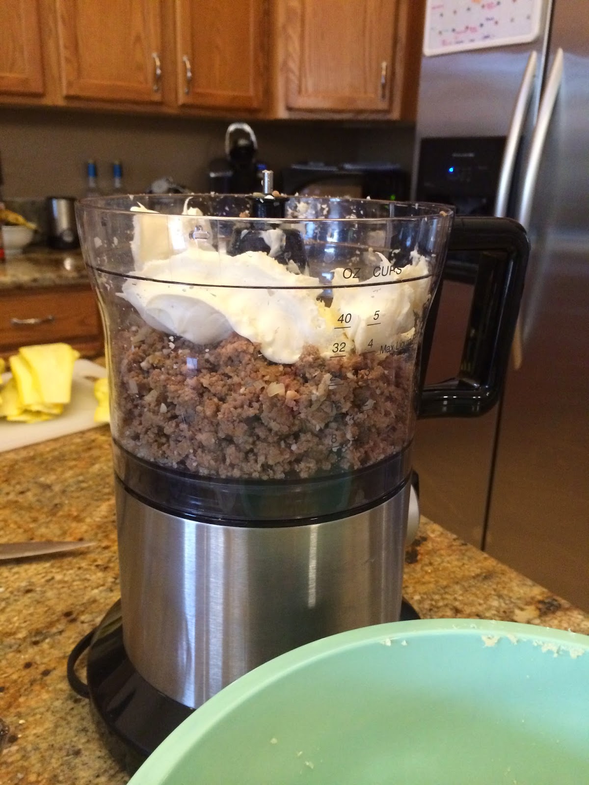 4. Squeeze all of the excess water out of the spinach. Then place chicken, spinach, salt, pepper, and mascarpone into a food processor or blender and puree until mixture reaches desired consistency. (We went with fairly smooth)