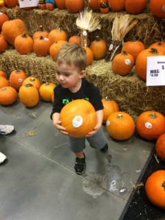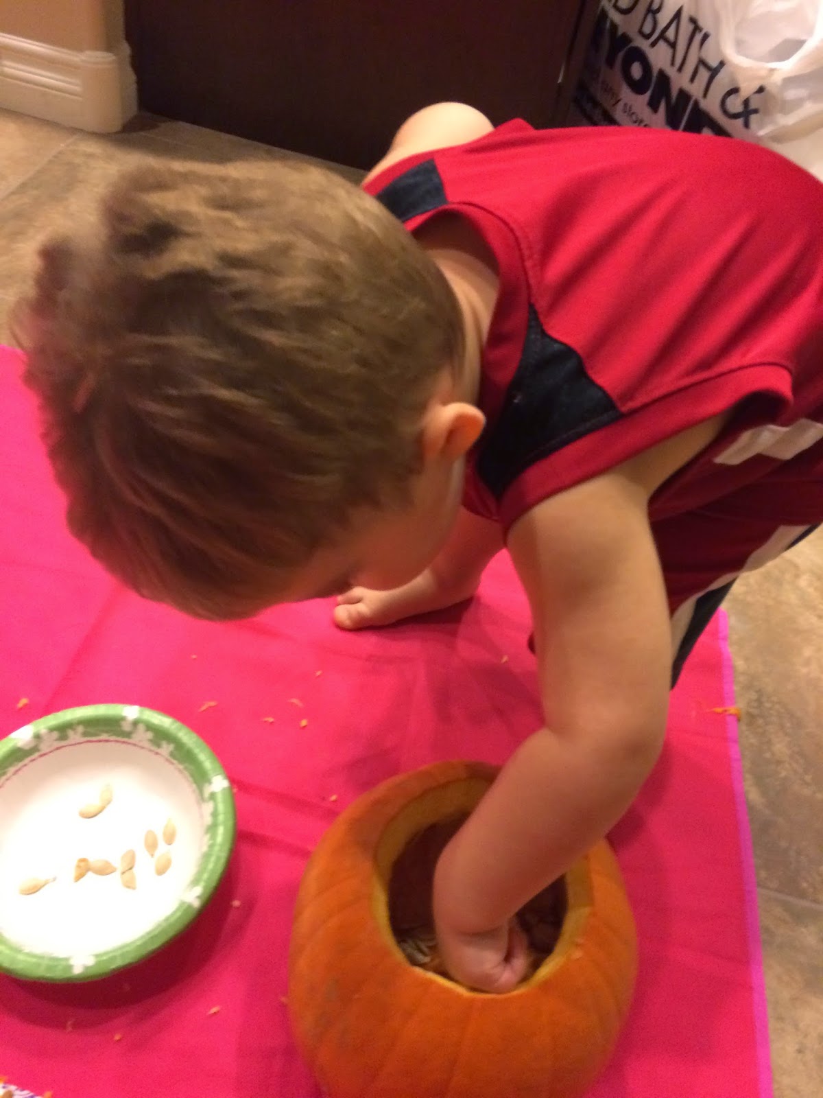 I think he was just sick of me and ready for daddy to be home. Mr. Peach has been quite busy with work this week so Cash has been stuck with plain ol mom most of the time. Thankfully Mr. Peach brought home dinner and after Cash & I stuffed our faces, Daddy let him watch an episode of Mickey while I set up the carving stuff. Then we got down to business. Cash was less than impressed.