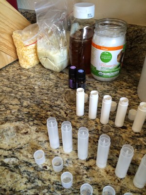 1. Line up the empty containers on counter. {if you’re using a lip balm stick double check to make sure it’s twisted down to the bottom of the tube}
