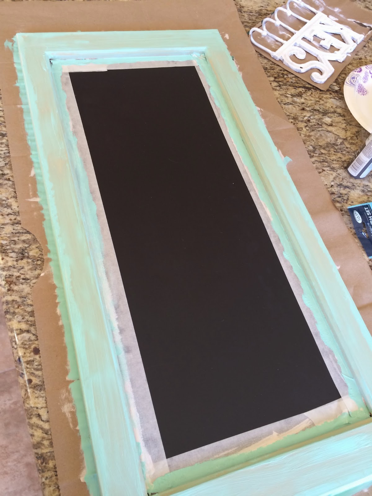 I’ve been searching for the perfect size frame for the space next to the fridge for months. I literally stumbled upon just the right one at Hobby Lobby a few weeks back. It didn’t start out the right color for our space but with a few coats of paint (which I already had in my stash) it turned out perfectly! Also between a great sale and a coupon I managed to get it for only $7. So worth it!!!