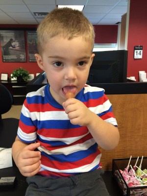 and then a sucker at the bank so he’s no slouch in the treat department.