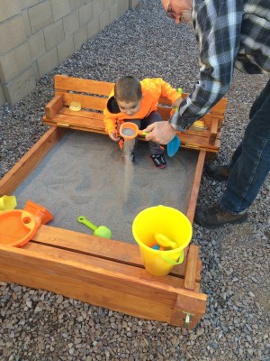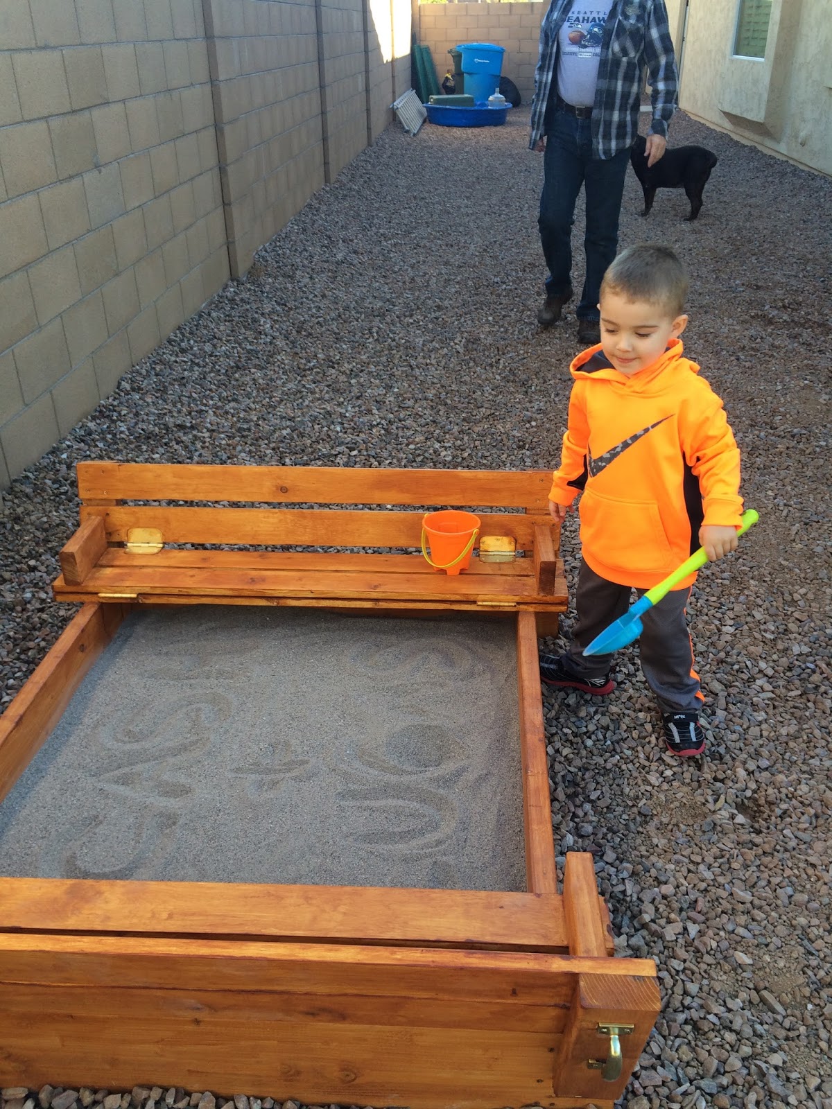 With everything else we had going that week, It only took him a day & a half to build it all. Another afternoon to stain it, once it was dry we cleared the rock, laid down a tarp and set it up full of sand.