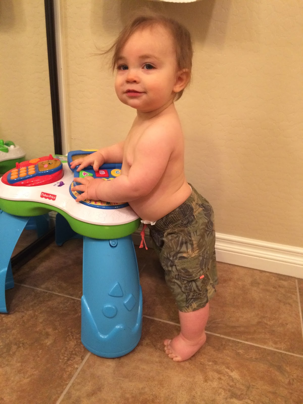 Favorite Activities: splashing in the bathtub. talking with daddy. playing with big brother & terrorizing big brother by taking his favorite toys. eating. pulling himself to stand on everything he can.