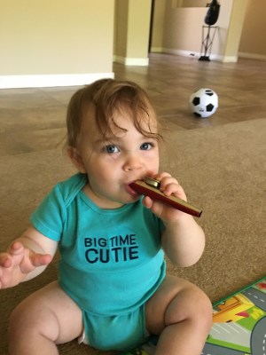 Favorite Toys: Every Ball we own. But especially the soft soccer ball & basketball. The Tupperware Shape Sorter is a big hit. He’s really getting the hang of which shapes match. T.V remotes, water bottles and cardboard boxes are still favorites as well.