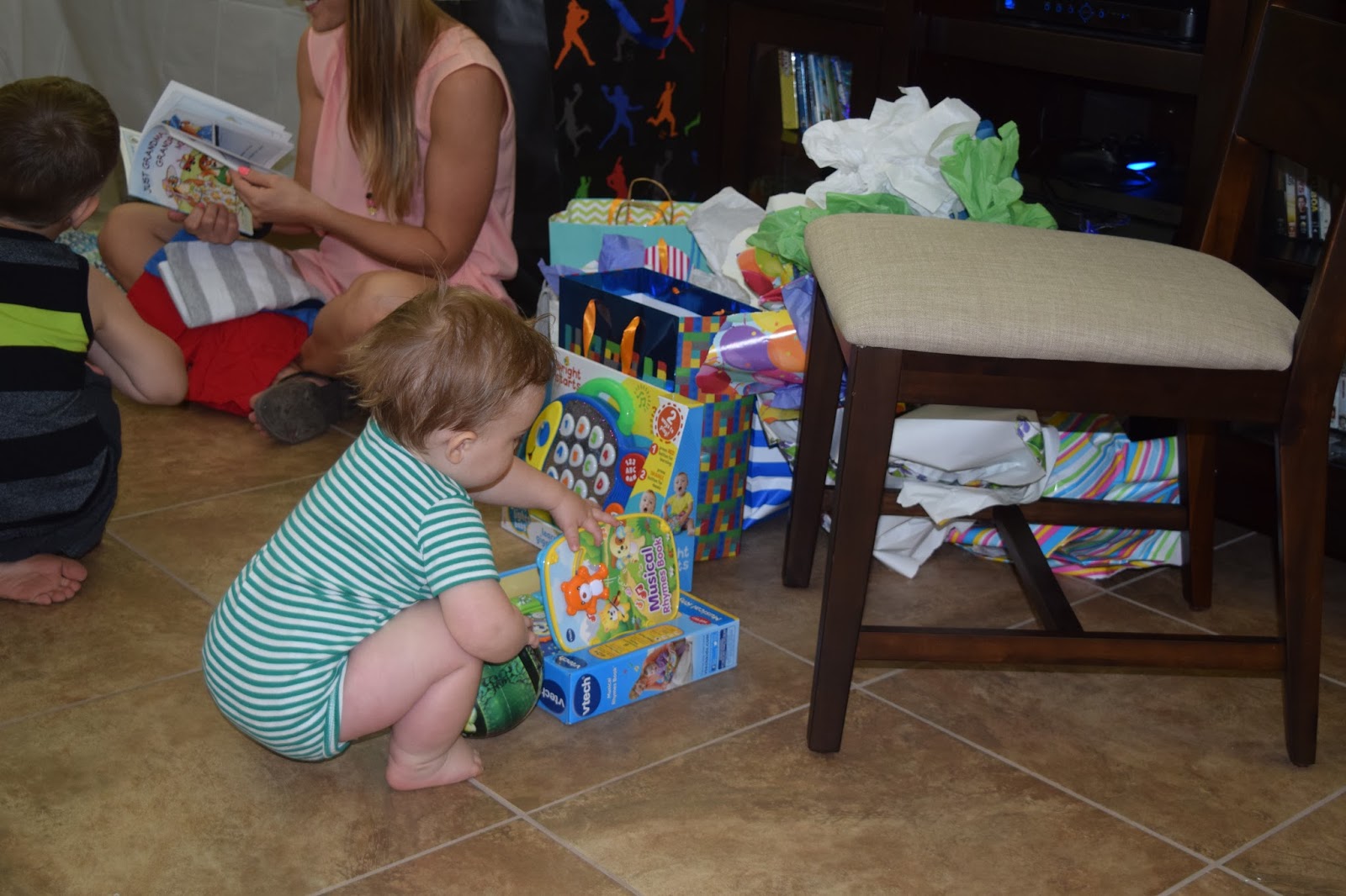 Typical present opening… Mom unwrapping, Child playing