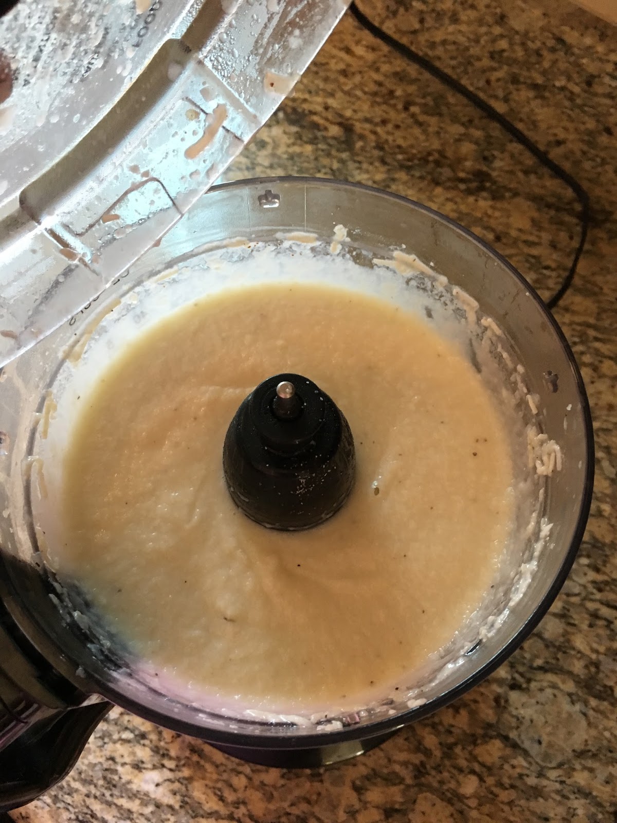 2. Once the cauliflower is fork tender drain excess liquid and put into a food processor. Add in all other ingredients (chicken broth, coconut milk, spices, garlic, shallots, part cheese) Then blend till creamy.