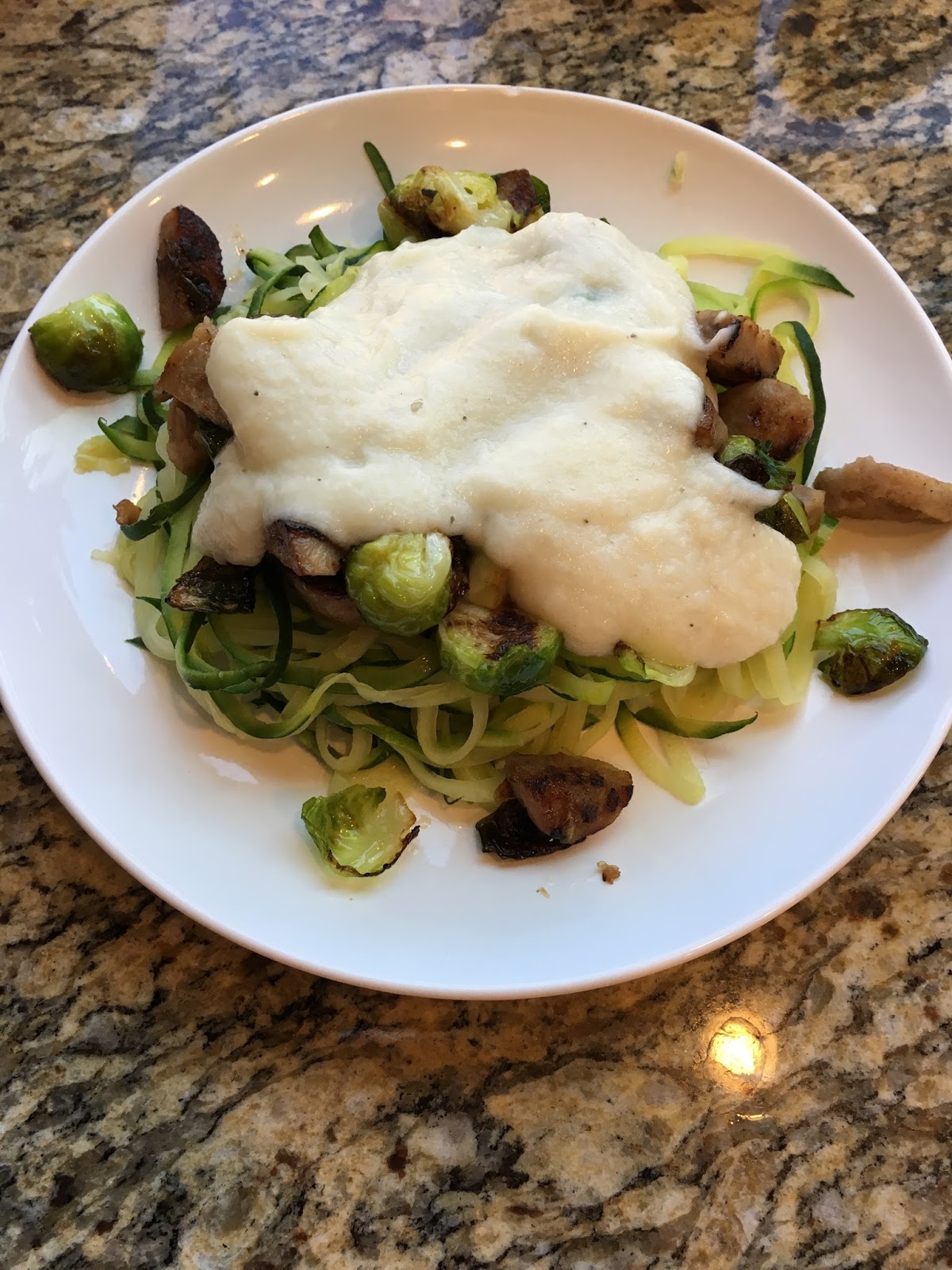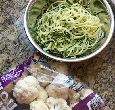 First, I get out all my ingredients. Then I chop up anything that needs to be chopped (extra veggies, meat, zoodles made). Next, I start the water boiling. Get my cauliflower into steam and start to sauté any meat or extra veggies. While the cauliflower steams you even have time to grill chicken if you’re feeling feisty. Then it’s a matter of adding your sauce ingredients to the food processor, hitting blend and dumping the zoodles into the boiling water and finishing off your sauté (tonight I chose chicken sausage, brussel sprouts and garlic cloves). Drain the “noodles” and plate it all up. Then Enjoy!!
